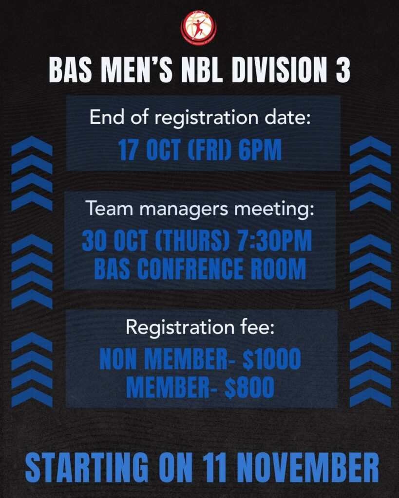 Dear BAS Referees, As part of the NBA Rising Stars Invitation initiatives, the Basketball Association of Singapore (BAS) is proud to announce an exciting program aimed at uplifting and developing our local referees. This is a unique opportunity to learn from some of the best referees from the NBA and to reinvigorate our refereeing community with fresh energy, insights, and inspiration. We encourage all referees to sign up early to secure your spot and avoid disappointment. 👉 Click the link below to register now! Let’s continue to grow and strengthen our refereeing standards—together! For Registration: Click Here !